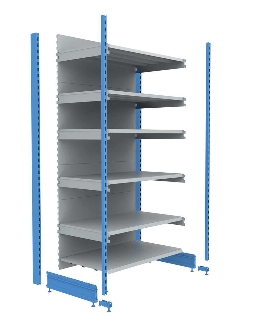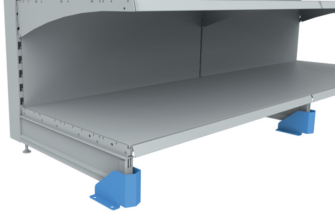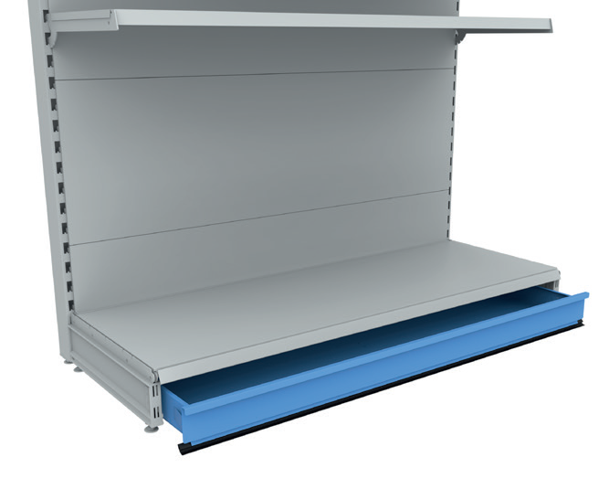 Myymälähyllyjärjestelmä ei sisällä lisäpystyjalkaa, jalkaa, gondolin yläosaa, jalkalistaa ja data(hinta)listaa, jotka voidaan tilata erillisinä elementteinä.